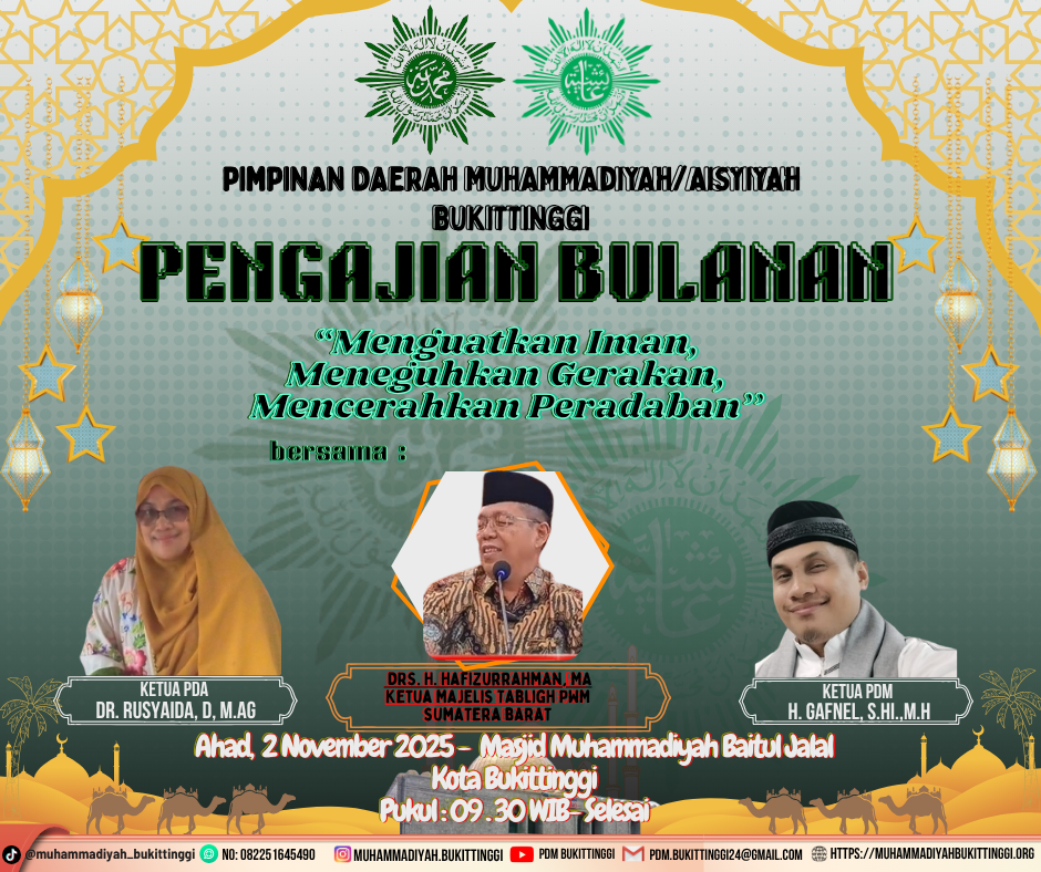 Segala puji bagi Allah Subhanahu Wa Ta’ala yang telah memberikan kita nikmat iman, Islam, dan kesehatan, sehingga kita dapat terus berkontribusi dalam perjuangan dakwah dan pengembangan umat. Shalawat serta salam kita haturkan kepada junjungan kita, Nabi Muhammad Shallallahu ‘Alaihi Wasallam, beserta keluarga, sahabat, dan para pengikutnya hingga akhir zaman.Dengan penuh rasa syukur dan bangga, kami menyambut kehadiran website resmi Muhammadiyah Bukittinggi sebagai salah satu sarana untuk menyeb...